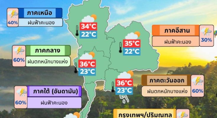 กรุงเทพและปริมณฑล มีฝนฟ้าคะนอง ร้อยละ 60 ของพื้นที่ และมีฝนตกหนักบางแห่ง อุณหภูมิต่ำสุด 24-25 องศาเซลเซียส อุณหภูมิสูงสุด 34-37 องศาเซลเซียส ลมตะวันออกเฉียงใต้ ความเร็ว 10-20 กม./ชม.